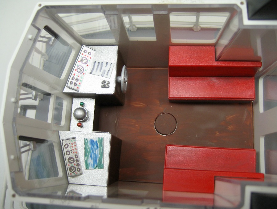 The bridge interior was slightly improved - floor painted brown, seats dirtied a bit, instruments drawn onto the panels with indelible pens and some 'documents' added to the desks made from plastic card coloured with pens again.